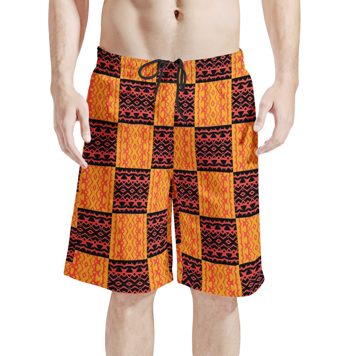 Men's All Over Board Shorts - Black and Orange Tribal Design